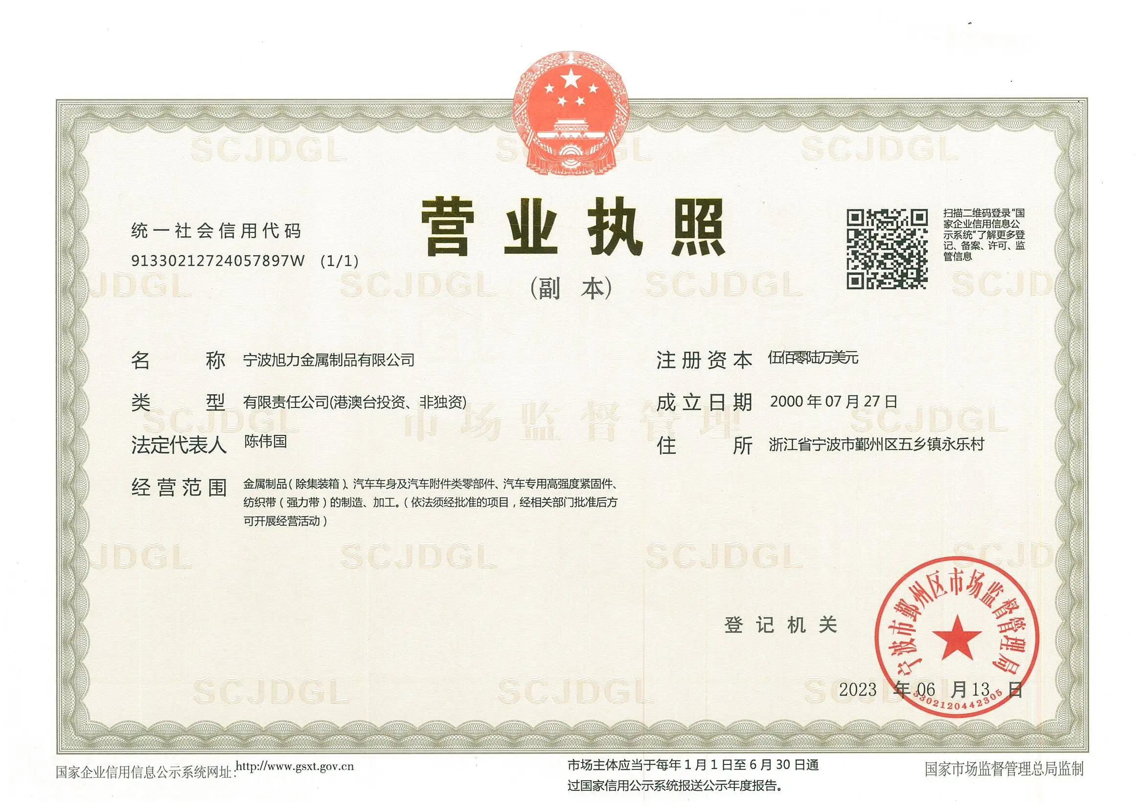 Registered address : Yongle Village, Wuxiang Town Ningbo Zhejiang China